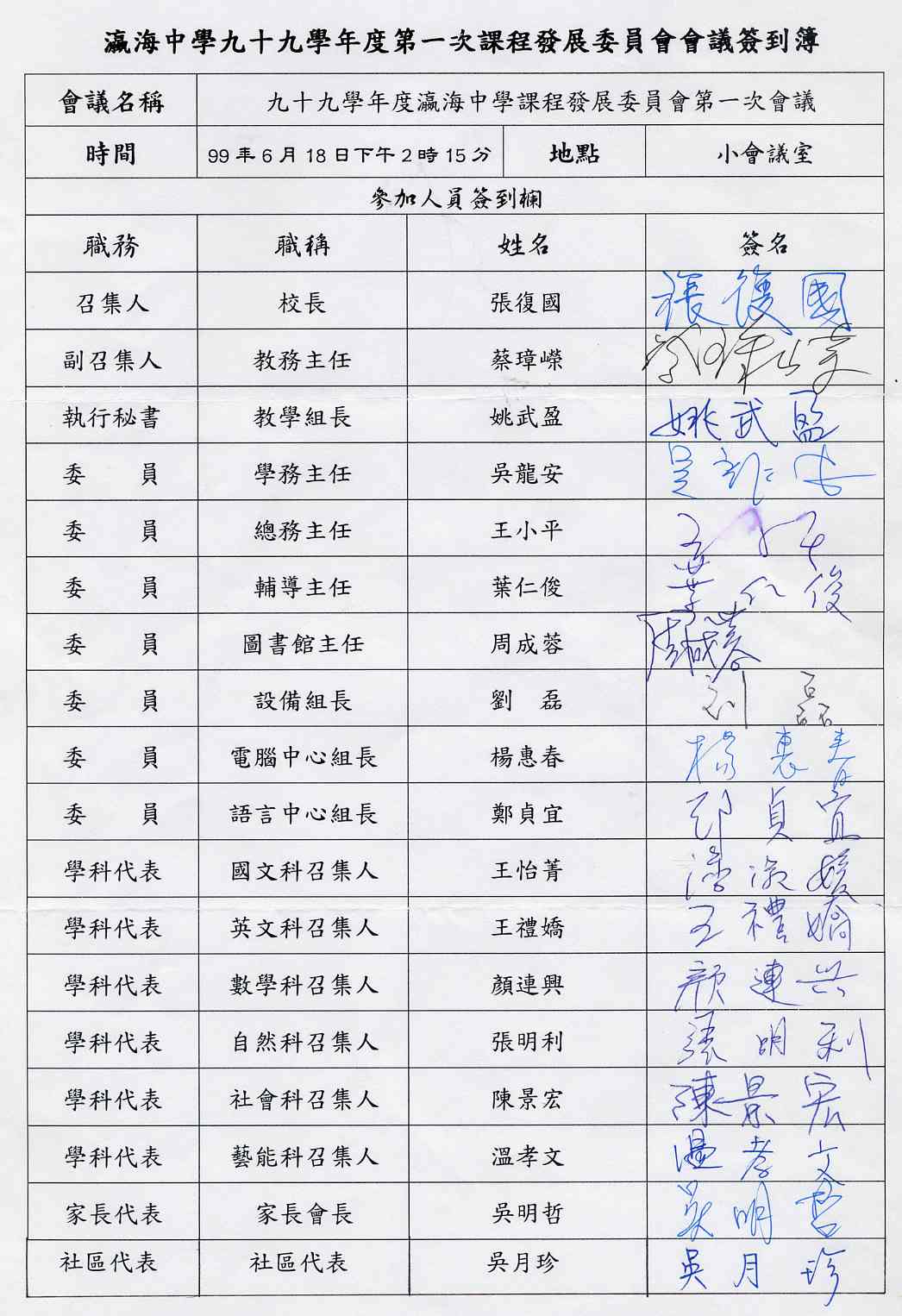 台南市瀛海中學99學年度第1學期課程發展委員會會議記錄