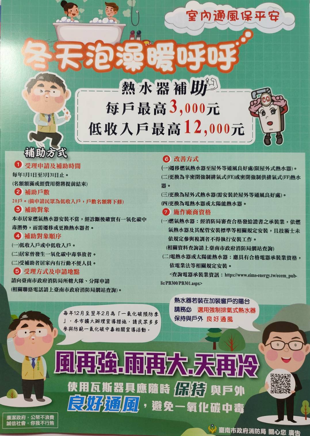 一、拒收逾期鋼瓶進家門,簽訂供氣契約保權益。 二、使用液化石油氣容器連接燃氣設施之場所(如:餐廳、小吃及洗衣店等), 其使用量不得超過1000公斤,並符合 法令相關規定。 三、寶貝放炮要盯牢,以免受罰傷荷包。 四、爆竹煙火應選購有認可標示得產品,並依照產品使用說明施放。 五、使用瓦斯器具應隨時保持與戶外良好通風,避免一氧化碳中毒。 六、居家燃氣熱水器安裝不當且經診斷後確實有一氧化碳中毒潛勢,需遷移或更換熱水 器者(更換之熱水器得包括電熱水器或太陽能熱水器),最高補助3000元。